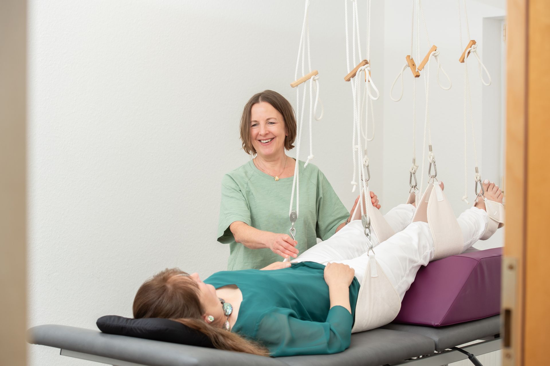 Während der Behandlung im Schlingentisch liegen Sie bequem auf einer Therapieliege. Ihr Becken und Ihre Beine oder auch Kopf und Arme sind in Stoffschlingen abgelegt, die durch Karabinerhaken am Schlingentisch befestigt sind.